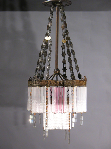 We were surprised by the impressive size of the fixture when we saw it in person. It has two tiers of tubular crystals with some colored beads and other cut glass prisms. Suspended by very interesting chains.