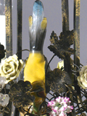 has a bird in the middle of a bush with flowers. It seems to be eating or drinking so it was hard to get a good picture of the